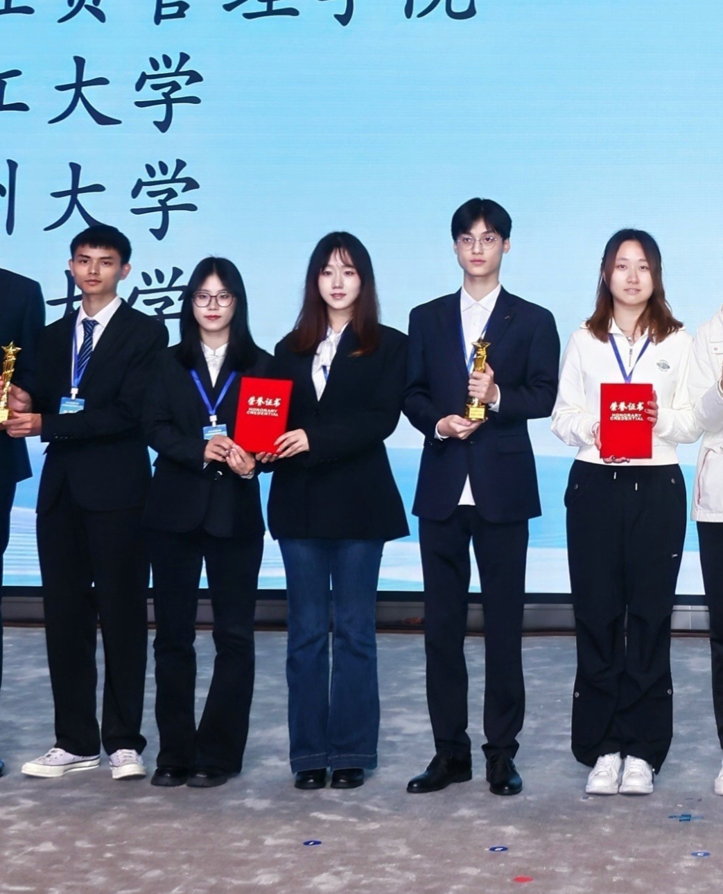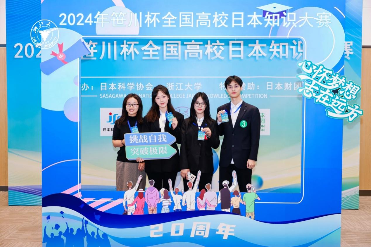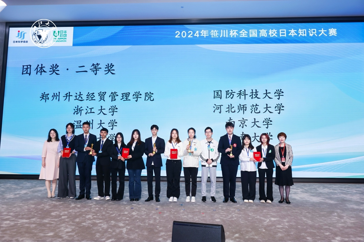 2024年10月25日至27日,由浙江大学与日本科学协会共同主办,并获得日本财团特别赞助的2024年“笹川杯”全国高校日本知识大赛在浙江大学成功举办。来自北京大学、南京大学、中国人民大学、北京外国语大学、上海外国语大学、天津外国语大学等全国100所高校的近400名师生齐聚一堂,经过两天的精彩比拼决出了团体及个人赛的奖项。我院日语系2022级毕瑛琪、孙思雅同学以及商学院2021级刘朝武同学组成的联合队伍参加角逐,团队由日语系张敏老师指导并陪同前往。经过紧张激烈的比拼后,我校代表队不负众望,在众多参赛队伍中脱颖而出,最终取得了团体赛全国二等奖!同时,日语专业学生孙思雅同学以其出色的表现获得了个人赛优秀奖,张敏老师获得团体杰出指导教师奖。
