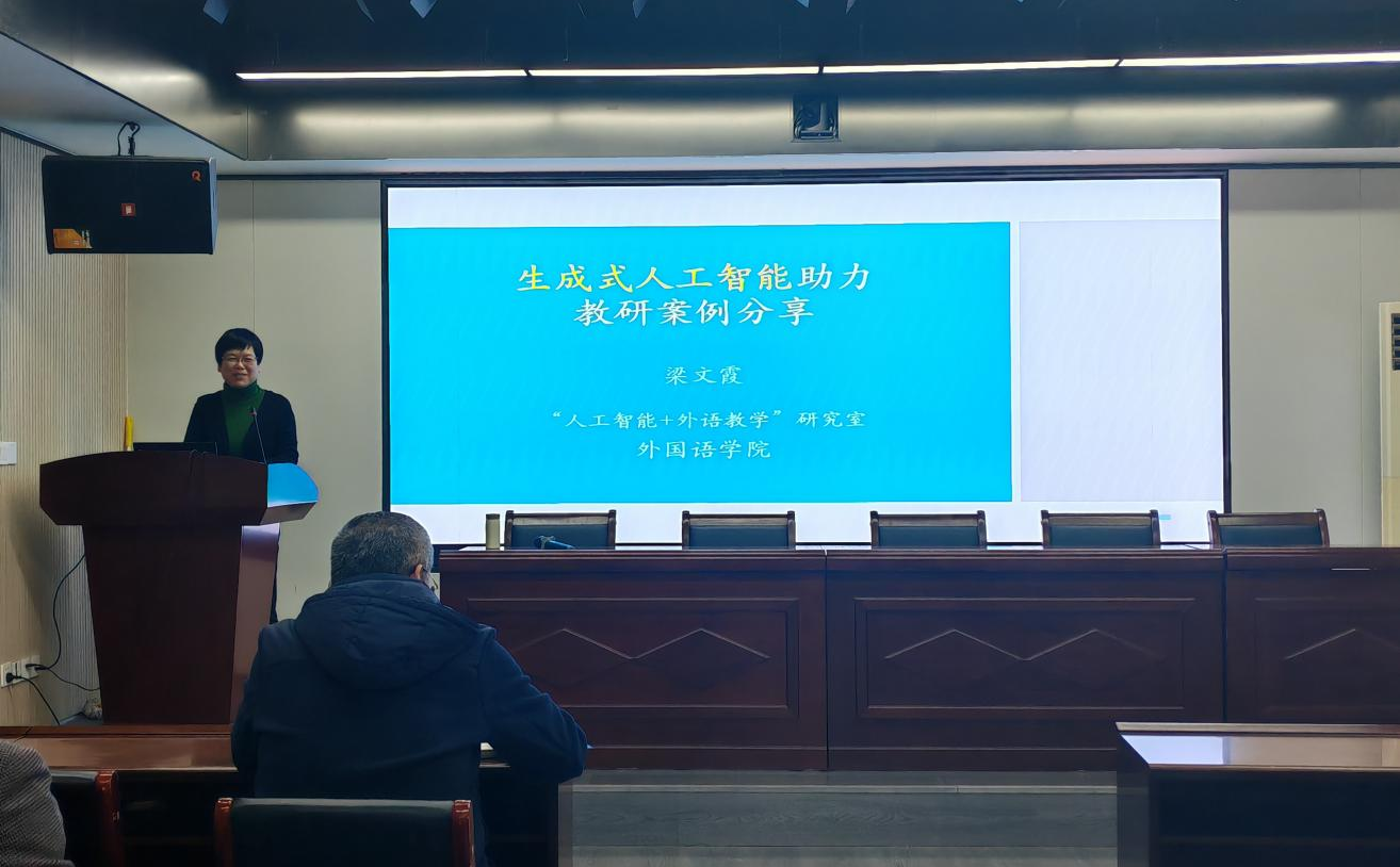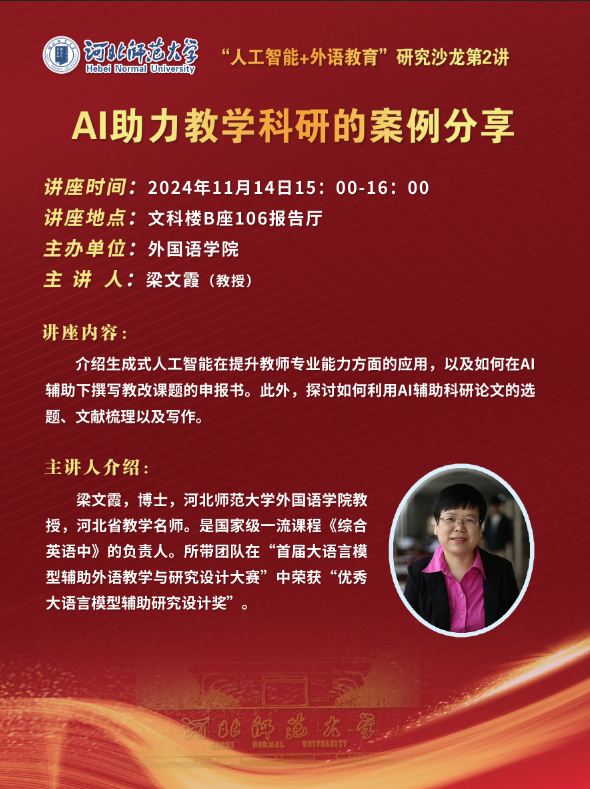 2024年11月14日下午,同人漫画 “人工智能+外语教育”研究室的梁文霞老师以“AI助力教学科研的案例分享”为题,开展了同人漫画 “人工智能+外语教育”研究沙龙的第2讲,讲座由英语教学法教研室张靖主任主持。梁老师在讲座中介绍了生成式人工智能在提升教师专业能力方面的应用,探讨了如何利用AI辅助撰写教改课题申报书及论文选题和写作等内容。