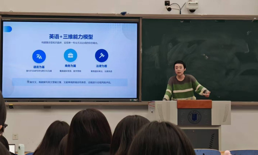 英语(非师范)专业系主任张明明老师从国家战略与时代需求的视角切入,精准定位了英语(非师范)专业的独特优势。此外,张老师还结合实践教学与能力提升路径,系统解读了专业就业前景与升学通道,生动展示了英语(非师范)专业融合发展的广阔空间。
